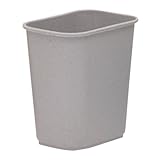 The Rubbermaid Commercial Deskside Vanity trash can is a rectangular wastebasket, made of LLDPE, with a rolled rim. LLDPE (linear low-density polyethylene) has greater resistance to dents, cracks, punctures, and ultraviolet (UV) rays than LDPE (low-density polyethylene). This injection-molded garbage can has a rolled rim for added strength. Rounded corners and smooth contours enable the trash can to be wiped clean. It measures 10-1/8 x 6-3/4 x 9-7/8 inches (H x W x D). (H is height, the vertical distance from lowest to highest point; W is width, the horizontal distance from left to right; D is depth, the horizontal distance from front to back.) It has a capacity of 8-1/8 quarts. The Rubbermaid Commercial Deskside Vanity trash can is suitabl